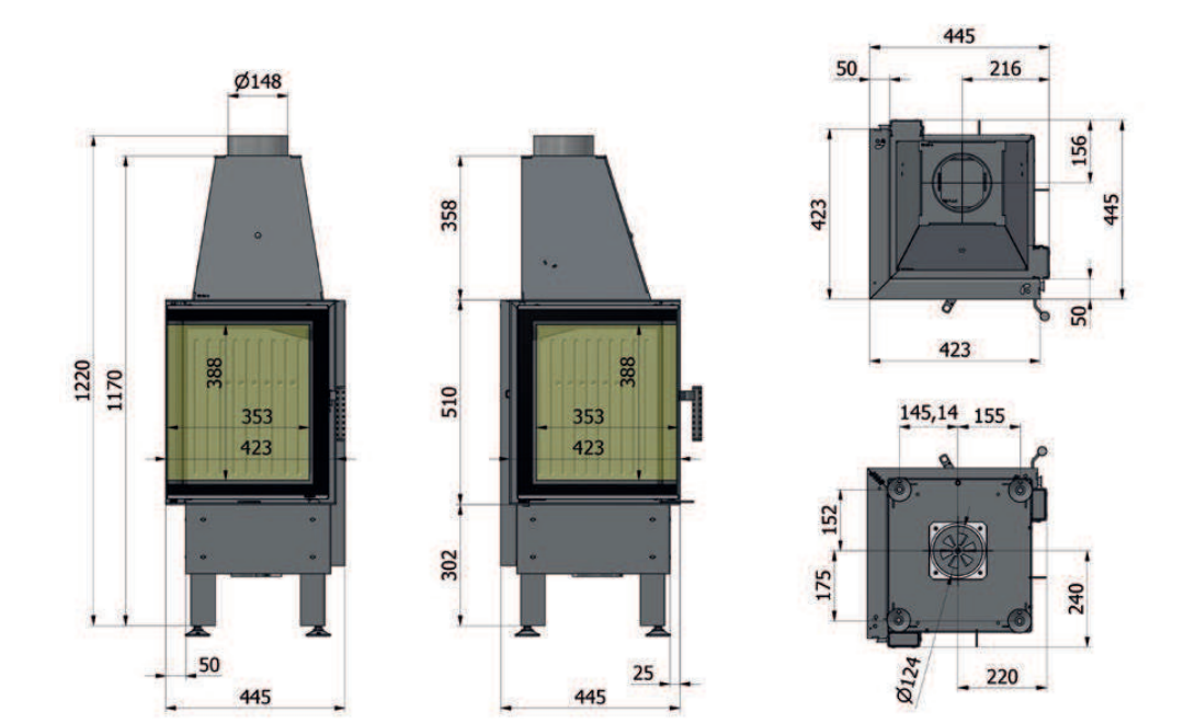 - Spód paleniska odpowiednio obniżony względem drzwi - zapewnia miejsce na załadunek drewna i popiół - komfort dla użytkownika