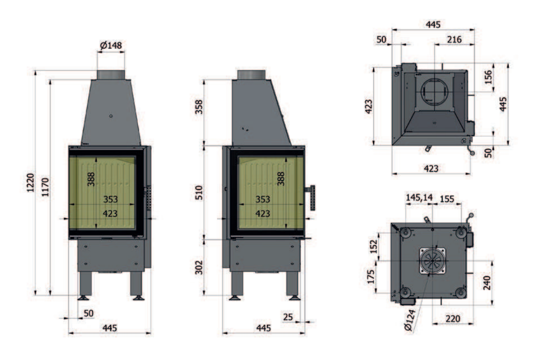 - Spód paleniska odpowiednio obniżony względem drzwi - zapewnia miejsce na załadunek drewna i popiół - komfort dla użytkownika