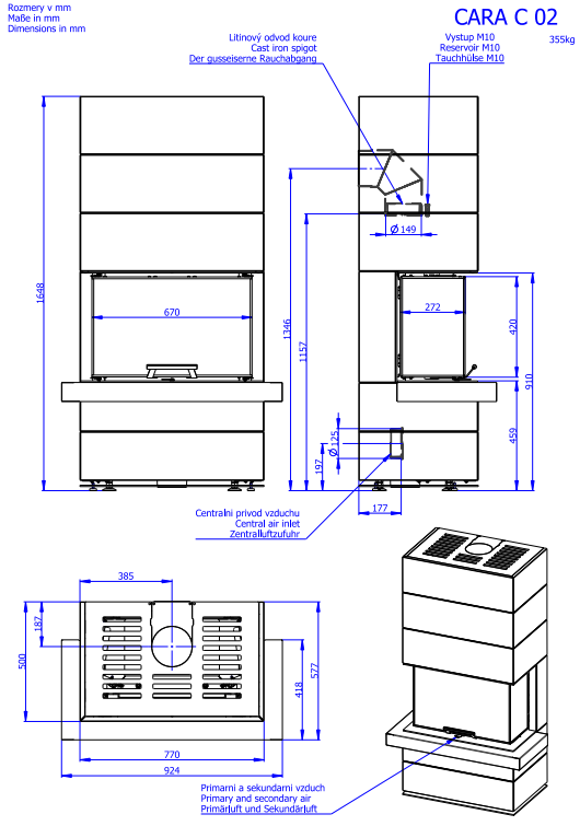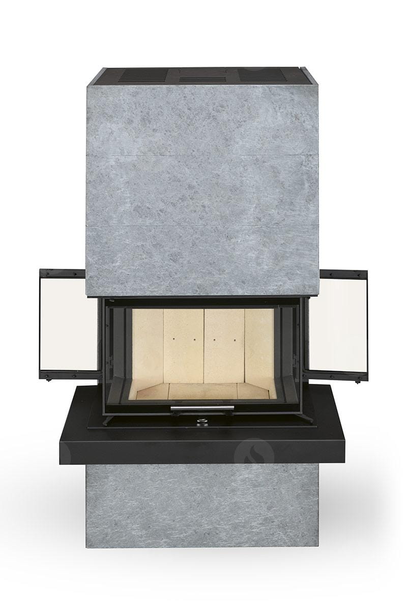 Designerskie kominki akumulacyjne CARA CS 02 i CARA CS N 03 nadają się też do domów niskoenergetycznych. Mają podnoszone do góry drzwiczki z precyzyjnym i lekkim posuwem SILENT LIFT. Komora spalania jest wyłożona kształtkami szmotowymi, w wersji standardowej bez rusztu z możliwością zmiany na wariant z rusztem. Dla optymalizacji spalania w górnej części komory spalania jest doprowadzane powietrze tercjalne. Innowacyjna komora spalania system DOUBLE SPIN zwiększa całkowitą sprawność kominka. Standardowo jest możliwe odprowadzenie spalin górą lub tyłem. Doprowadzenie powietrza wtórnego na wewnętrzną powierzchnię szyby drzwiczek zapobiega jej zanieczyszczaniu. Doprowadzenie powietrza pierwotnego i wtórnego obsługuje się za pomocą jednego elementu sterującego. Dostateczne doprowadzenie powietrza dla optymalnego spalania zapewnia system CDP – centralne doprowadzenie powietrza z zewnątrz. Kominek za dopłatą można wyposażyć w kształtki akumulacyjne, które akumulują energię cieplną a następnie oddają z powrotem do pomieszczenia jeszcze kilka godzin po wygaśnięciu ognia. Kominki linii CARA są obkładane wielkopowierzchniowym naturalnym kamieniem lub blachą z lakierowanym wykończeniem powierzchni, ekran tylnego płaszcza umożliwia umieszczenie pieca przy samej ścianie.