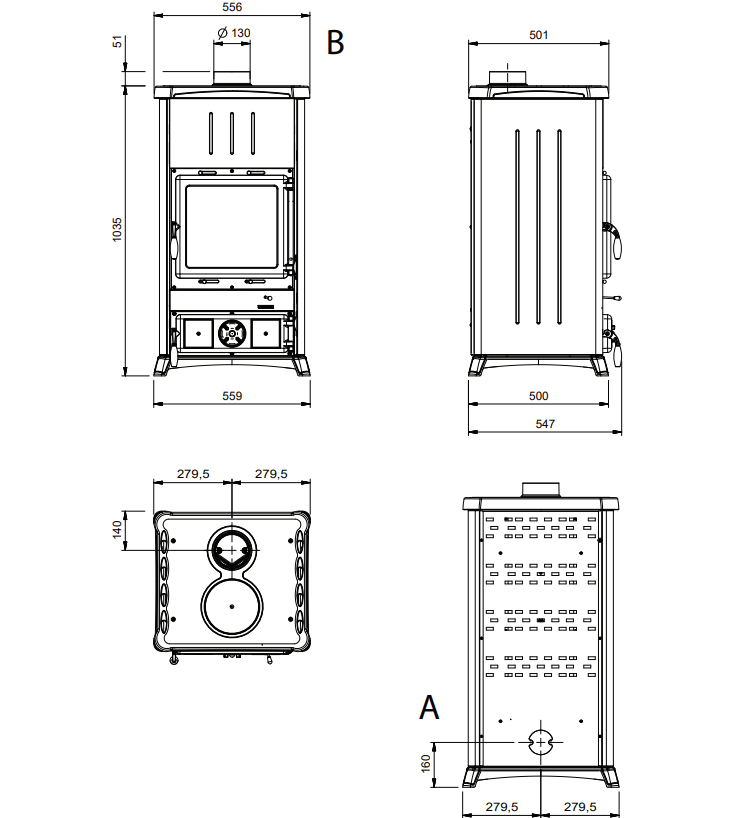 Żeliwne palenisko z systemem dopalania • Zewnętrzna obudowa ze stali • Drzwiczki, przednia część i podstawa z żeliwa emaliowanego • Odporne szkło ceramiczne do 750°.